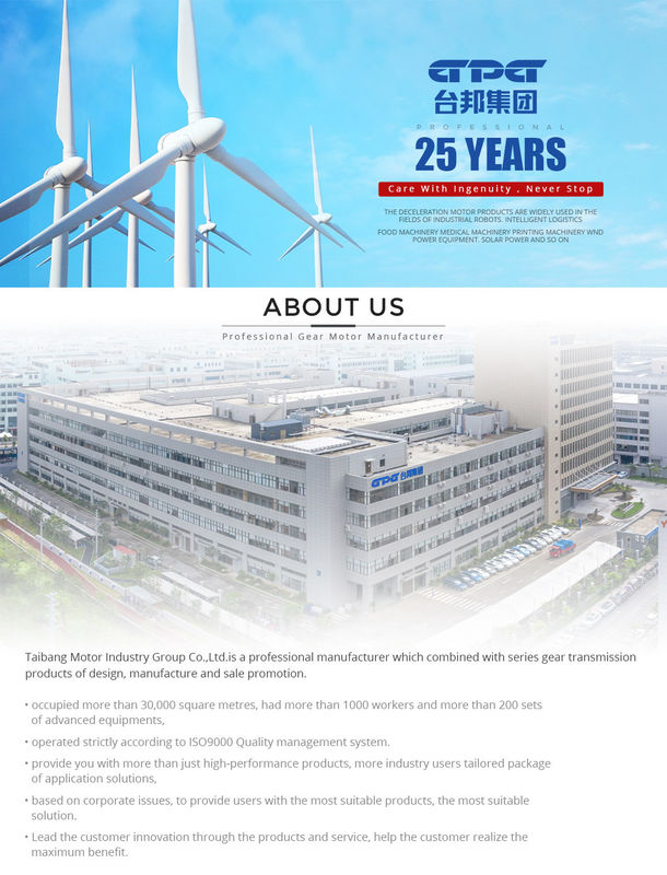 Taibang é cometido a criar o valor para clientes e a proporcionar produtos superiores do motor da engrenagem e serviços técnicos. Como um líder na inovação no campo do motor alinhado, Taibang fornece não somente clientes os produtos de capacidade elevada, mas igualmente pode costurar soluções para clientes. Ao mesmo tempo, estabeleça uma rede eficiente e sadia das vendas e um sistema de serviço pós-venda proporcionar no país e no estrangeiro o melhor serviço da qualidade aos clientes.